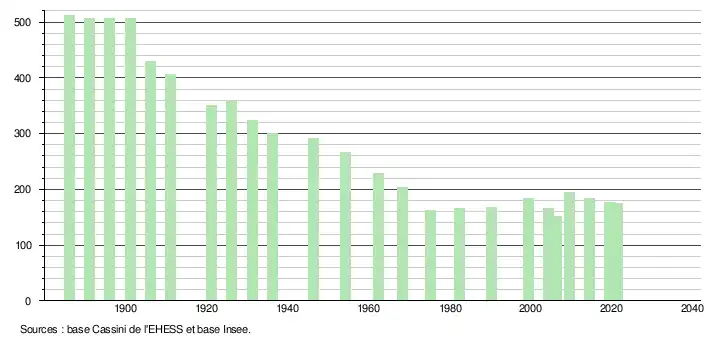 | L'évolution du nombre d'habitants est connue à travers les recensements de la population effectués dans la commune depuis 1886. Pour les communes de moins de 10 000 habitants, une enquête de recensement portant sur toute la population est réalisée tous les cinq ans, les populations légales des années intermédiaires étant quant à elles estimées par interpolation ou extrapolation[27]. Pour la commune, le premier recensement exhaustif entrant dans le cadre du nouveau dispositif a été réalisé en 2004[28]. En 2021, la commune comptait 175 habitants[Note 5], en diminution de 4,37 % par rapport à 2015 (Lot : +0,89 %, France hors Mayotte : +1,84 %). |