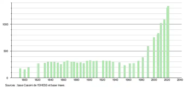 L'évolution du nombre d'habitants est connue à travers les recensements de la population effectués dans la commune depuis 1793. Pour les communes de moins de 10 000 habitants, une enquête de recensement portant sur toute la population est réalisée tous les cinq ans, les populations légales des années intermédiaires étant quant à elles estimées par interpolation ou extrapolation[33]. Pour la commune, le premier recensement exhaustif entrant dans le cadre du nouveau dispositif a été réalisé en 2005[34].