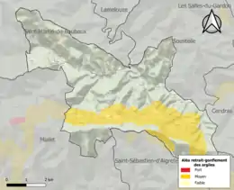 La commune est vulnérable au risque de mouvements de terrains constitué principalement du retrait-gonflement des sols argileux[25]. Cet aléa est susceptible d'engendrer des dommages importants aux bâtiments en cas d’alternance de périodes de sécheresse et de pluie. 23,9 % de la superficie communale est en aléa moyen ou fort (67,5 % au niveau départemental et 48,5 % au niveau national). Sur les 234 bâtiments dénombrés sur la commune en 2019, 137 sont en aléa moyen ou fort, soit 59 %, à comparer aux 90 % au niveau départemental et 54 % au niveau national. Une cartographie de l'exposition du territoire national au retrait gonflement des sols argileux est disponible sur le site du BRGM[26],[Carte 1].