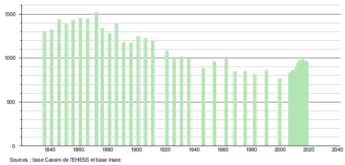 L'évolution du nombre d'habitants est connue à travers les recensements de la population effectués dans la commune depuis 1836. Pour les communes de moins de 10 000 habitants, une enquête de recensement portant sur toute la population est réalisée tous les cinq ans, les populations légales des années intermédiaires étant quant à elles estimées par interpolation ou extrapolation[14]. Pour la commune, le premier recensement exhaustif entrant dans le cadre du nouveau dispositif a été réalisé en 2008[15].