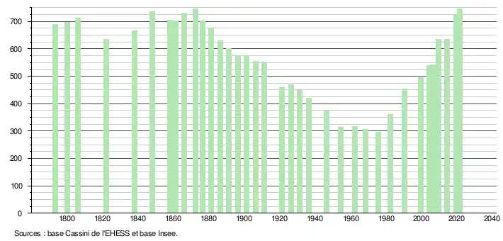 L'évolution du nombre d'habitants est connue à travers les recensements de la population effectués dans la commune depuis 1793. Pour les communes de moins de 10 000 habitants, une enquête de recensement portant sur toute la population est réalisée tous les cinq ans, les populations légales des années intermédiaires étant quant à elles estimées par interpolation ou extrapolation[17]. Pour la commune, le premier recensement exhaustif entrant dans le cadre du nouveau dispositif a été réalisé en 2004[18].