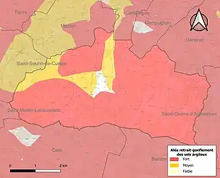 Le retrait-gonflement des sols argileux est susceptible d'engendrer des dommages importants aux bâtiments en cas d’alternance de périodes de sécheresse et de pluie. 98,2 % de la superficie communale est en aléa moyen ou fort (67,4 % au niveau départemental et 48,5 % au niveau national). Sur les 464 bâtiments dénombrés sur la commune en 2019, 449 sont en aléa moyen ou fort, soit 97 %, à comparer aux 84 % au niveau départemental et 54 % au niveau national. Une cartographie de l'exposition du territoire national au retrait gonflement des sols argileux est disponible sur le site du BRGM[20],[Carte 2].