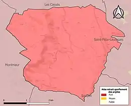 Le retrait-gonflement des sols argileux est susceptible d'engendrer des dommages importants aux bâtiments en cas d’alternance de périodes de sécheresse et de pluie. La totalité de la commune est en aléa moyen ou fort (75,2 % au niveau départemental et 48,5 % au niveau national). Sur les 113 bâtiments dénombrés sur la commune en 2019, 113 sont en aléa moyen ou fort, soit 100 %, à comparer aux 94 % au niveau départemental et 54 % au niveau national. Une cartographie de l'exposition du territoire national au retrait gonflement des sols argileux est disponible sur le site du BRGM[22],[Carte 3].