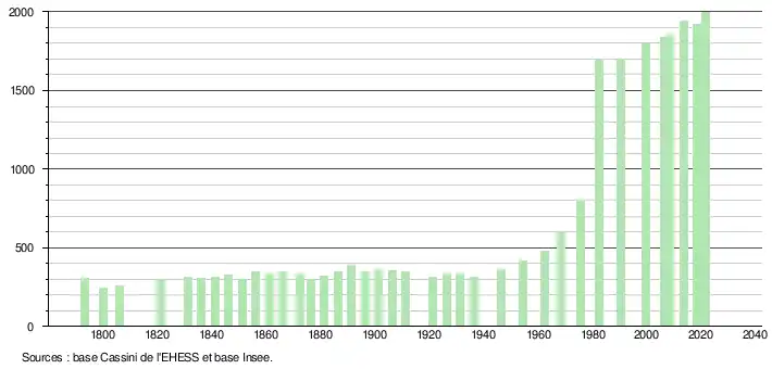 L'évolution du nombre d'habitants est connue à travers les recensements de la population effectués dans la commune depuis 1793. Pour les communes de moins de 10 000 habitants, une enquête de recensement portant sur toute la population est réalisée tous les cinq ans, les populations légales des années intermédiaires étant quant à elles estimées par interpolation ou extrapolation[22]. Pour la commune, le premier recensement exhaustif entrant dans le cadre du nouveau dispositif a été réalisé en 2008[23].