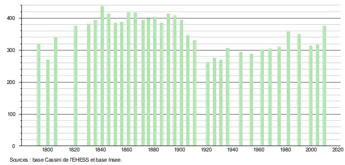L'évolution du nombre d'habitants est connue à travers les recensements de la population effectués dans la commune depuis 1793. À partir du , les populations légales des communes sont publiées annuellement dans le cadre d'un recensement qui repose désormais sur une collecte d'information annuelle, concernant successivement tous les territoires communaux au cours d'une période de cinq ans. Pour les communes de moins de 10 000 habitants, une enquête de recensement portant sur toute la population est réalisée tous les cinq ans, les populations légales des années intermédiaires étant quant à elles estimées par interpolation ou extrapolation[6]. Pour la commune, le premier recensement exhaustif entrant dans le cadre du nouveau dispositif a été réalisé en 2004[7],[Note 2].