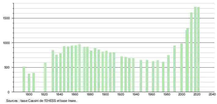 | L'évolution du nombre d'habitants est connue à travers les recensements de la population effectués dans la commune depuis 1793. Pour les communes de moins de 10 000 habitants, une enquête de recensement portant sur toute la population est réalisée tous les cinq ans, les populations légales des années intermédiaires étant quant à elles estimées par interpolation ou extrapolation[25]. Pour la commune, le premier recensement exhaustif entrant dans le cadre du nouveau dispositif a été réalisé en 2007[26]. En 2021, la commune comptait 1 725 habitants[Note 3], en augmentation de 2,31 % par rapport à 2015 (Landes : +4,9 %, France hors Mayotte : +1,84 %). |