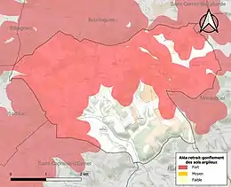 Les mouvements de terrains susceptibles de se produire sur la commune sont des tassements différentiels[37]. Le retrait-gonflement des sols argileux est susceptible d'engendrer des dommages importants aux bâtiments en cas d’alternance de périodes de sécheresse et de pluie[38]. 68,5 % de la superficie communale est en aléa moyen ou fort (58,6 % au niveau départemental et 48,5 % au niveau national métropolitain)[Carte 4]. Depuis le , en application de la loi ÉLAN, différentes contraintes s'imposent aux vendeurs, maîtres d'ouvrages ou constructeurs de biens situés dans une zone classée en aléa moyen ou fort[Note 6],[39].