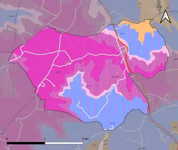 L'occupation des sols de la commune, telle qu'elle ressort de la base de données européenne d’occupation biophysique des sols Corine Land Cover (CLC), est marquée par l'importance des territoires agricoles (76,9 % en 2018), une proportion identique à celle de 1990 (77 %). La répartition détaillée en 2018 est la suivante : terres arables (35,2 %), forêts (23 %), zones agricoles hétérogènes (21,6 %), cultures permanentes (20,1 %), zones urbanisées (0,2 %)[31]. L'évolution de l’occupation des sols de la commune et de ses infrastructures peut être observée sur les différentes représentations cartographiques du territoire : la carte de Cassini (XVIIIe siècle), la carte d'état-major (1820-1866) et les cartes ou photos aériennes de l'IGN pour la période actuelle (1950 à aujourd'hui)[Carte 3].