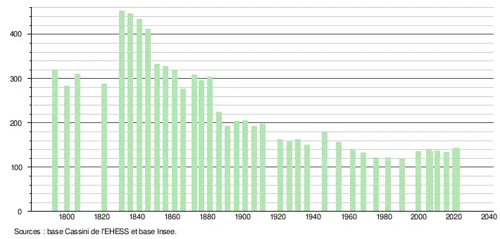 L'évolution du nombre d'habitants est connue à travers les recensements de la population effectués dans la commune depuis 1793. Pour les communes de moins de 10 000 habitants, une enquête de recensement portant sur toute la population est réalisée tous les cinq ans, les populations légales des années intermédiaires étant quant à elles estimées par interpolation ou extrapolation[47]. Pour la commune, le premier recensement exhaustif entrant dans le cadre du nouveau dispositif a été réalisé en 2005[48].