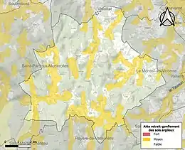 Le retrait-gonflement des sols argileux est susceptible d'engendrer des dommages importants aux bâtiments en cas d’alternance de périodes de sécheresse et de pluie. 31,2 % de la superficie communale est en aléa moyen ou fort (33,6 % au niveau départemental et 48,5 % au niveau national). Sur les 251 bâtiments dénombrés sur la commune en 2019, 74 sont en aléa moyen ou fort, soit 29 %, à comparer aux 25 % au niveau départemental et 54 % au niveau national. Une cartographie de l'exposition du territoire national au retrait gonflement des sols argileux est disponible sur le site du BRGM[18],[Carte 2].