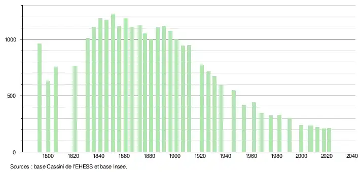 L'évolution du nombre d'habitants est connue à travers les recensements de la population effectués dans la commune depuis 1793. Pour les communes de moins de 10 000 habitants, une enquête de recensement portant sur toute la population est réalisée tous les cinq ans, les populations légales des années intermédiaires étant quant à elles estimées par interpolation ou extrapolation[22]. Pour la commune, le premier recensement exhaustif entrant dans le cadre du nouveau dispositif a été réalisé en 2007[23].