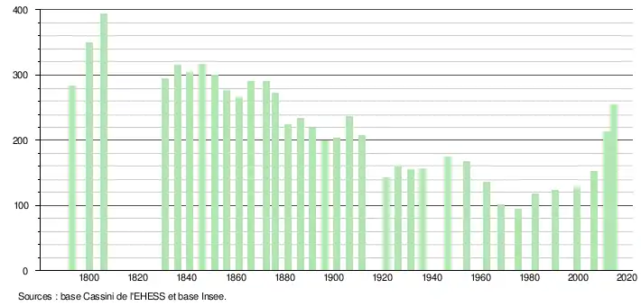 L'évolution du nombre d'habitants est connue à travers les recensements de la population effectués dans la commune depuis 1793. Pour les communes de moins de 10 000 habitants, une enquête de recensement portant sur toute la population est réalisée tous les cinq ans, les populations légales des années intermédiaires étant quant à elles estimées par interpolation ou extrapolation[10]. Pour la commune, le premier recensement exhaustif entrant dans le cadre du nouveau dispositif a été réalisé en 2006[11].
