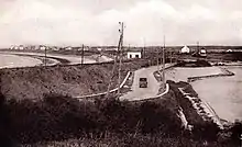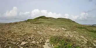 - La pointe de Beg-En-Aud[Note 7], connue pour son éperon barré attribué aux Vénètes qui l'utilisèrent comme camp retranché à l'époque gallo-romaine, d'où le folklore local qui en fait le village d'Astérix résistant à Jules César pendant la guerre des Vénètes[8]. Le tumulus mesurant 50 mètres de long et 5 mètres de haut pourrait être une tombe scandinave et a servi de talus de défense aux habitants de la pointe[15]. Le site a livré des silex attribués initialement au Néolithique. La prospection d'un locus a permis d'identifier un atelier de débitage[Note 8] daté de la fin du Mésolithique, comme à Téviec[16]. Sur ce site, il existe un four à goémon encore parfaitement intact. Les deux autres fours à goémons de la presqu'île sont reconstitués de part et d’autre du sentier de la pointe du Conguel[17].