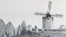 - Port Blanc (Porz Guen) et, nichées dans des criques, ses trois plages de sables grossiers avec graviers et galets. Le profil de leur estran très pointu subit de grandes variations saisonnières en fonction du régime des houles[10]. Site marqué par son arche (arche de Port-Blanc ou de Port-Gwen, aussi appelée la Roche Percée) menacée de disparition car elle est exposée aux tempêtes d'hiver en plein ouest, avec les vagues mesurant jusqu'à trois mètres[11] ; les « Dolmens du Port-Blanc » fouillés par Félix Gaillard en 1883 à la suite de la visite nocturne de quelques chercheurs de trésor. Ces dolmens sont en réalité un cairn d'une hauteur de 1 à 1,50 m, englobant deux dolmens à couloir (contenant les ossements humains de 37 individus, « ce qui ferait déjà de ce lot de loin le plus important ensemble exhumé d’un monument mégalithique sur le Massif armoricain »), et en annexe au nord-est, un bloc couché[12]. En façade, ce complexe mégalithique est flanqué d'un muret de pierre sèche servant de parement externe au monument, dont il ne reste aujourd'hui que l'assise basale. Le cairn, visible juste avant l’aménagement récent, est désormais recouvert d’un niveau de sable qui le camoufle. Ce complexe mégalithique est classé au titre des monuments historiques en 1889[13] ;