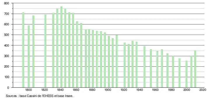 - Dans le tableau des recensements et le graphique, par convention dans Wikipédia, le principe a été retenu, pour les populations légales postérieures à 1999 de n’afficher dans le tableau des recensements et le graphique que les populations correspondant à l'année 2006, première population légale publiée calculée conformément aux concepts définis dans le décret no 2003-485 du 5 juin 2003, et les années correspondant à une enquête exhaustive de recensement pour les communes de moins de 10 000 habitants, ainsi que la dernière population légale publiée par l’Insee.