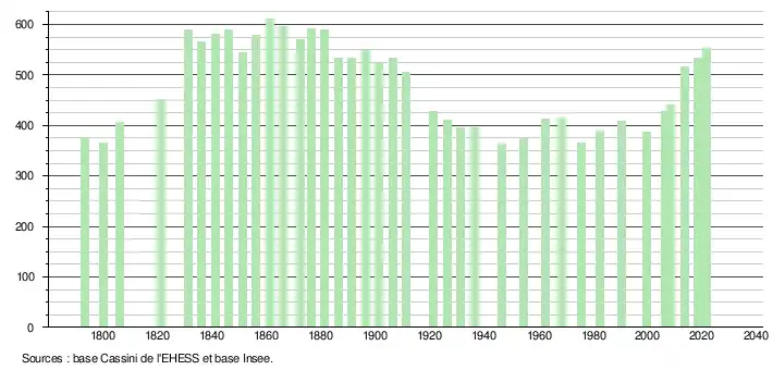 L'évolution du nombre d'habitants est connue à travers les recensements de la population effectués dans la commune depuis 1793. Pour les communes de moins de 10 000 habitants, une enquête de recensement portant sur toute la population est réalisée tous les cinq ans, les populations légales des années intermédiaires étant quant à elles estimées par interpolation ou extrapolation[17]. Pour la commune, le premier recensement exhaustif entrant dans le cadre du nouveau dispositif a été réalisé en 2008[18].