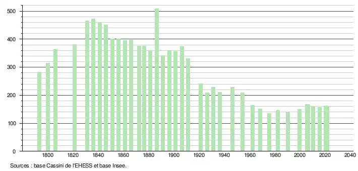 L'évolution du nombre d'habitants est connue à travers les recensements de la population effectués dans la commune depuis 1793. Pour les communes de moins de 10 000 habitants, une enquête de recensement portant sur toute la population est réalisée tous les cinq ans, les populations légales des années intermédiaires étant quant à elles estimées par interpolation ou extrapolation[16]. Pour la commune, le premier recensement exhaustif entrant dans le cadre du nouveau dispositif a été réalisé en 2005[17].