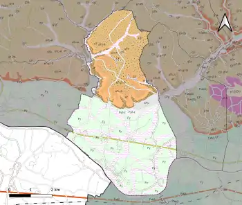 L'occupation des sols de la commune, telle qu'elle ressort de la base de données européenne d’occupation biophysique des sols Corine Land Cover (CLC), est marquée par l'importance des territoires agricoles (61 % en 2018), néanmoins en diminution par rapport à 1990 (63,1 %). La répartition détaillée en 2018 est la suivante : zones agricoles hétérogènes (31,1 %), forêts (30,3 %), terres arables (25,1 %), zones urbanisées (6,1 %), cultures permanentes (3,5 %), eaux continentales[Note 6] (2,6 %), prairies (1,3 %)[44]. L'évolution de l’occupation des sols de la commune et de ses infrastructures peut être observée sur les différentes représentations cartographiques du territoire : la carte de Cassini (XVIIIe siècle), la carte d'état-major (1820-1866) et les cartes ou photos aériennes de l'IGN pour la période actuelle (1950 à aujourd'hui)[Carte 3].