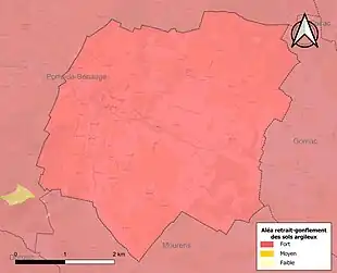 Le retrait-gonflement des sols argileux est susceptible d'engendrer des dommages importants aux bâtiments en cas d’alternance de périodes de sécheresse et de pluie. La totalité de la commune est en aléa moyen ou fort (67,4 % au niveau départemental et 48,5 % au niveau national). Sur les 163 bâtiments dénombrés sur la commune en 2019, 163 sont en aléa moyen ou fort, soit 100 %, à comparer aux 84 % au niveau départemental et 54 % au niveau national. Une cartographie de l'exposition du territoire national au retrait gonflement des sols argileux est disponible sur le site du BRGM[17],[Carte 2].