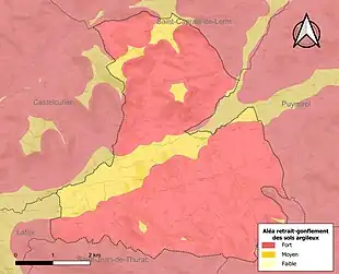 Le retrait-gonflement des sols argileux est susceptible d'engendrer des dommages importants aux bâtiments en cas d’alternance de périodes de sécheresse et de pluie[22]. La totalité de la commune est en aléa moyen ou fort (91,8 % au niveau départemental et 48,5 % au niveau national)[Carte 2]. Depuis le , en application de la loi ELAN, différentes contraintes s'imposent aux vendeurs, maîtres d'ouvrages ou constructeurs de biens situés dans une zone classée en aléa moyen ou fort[Note 3],[23].