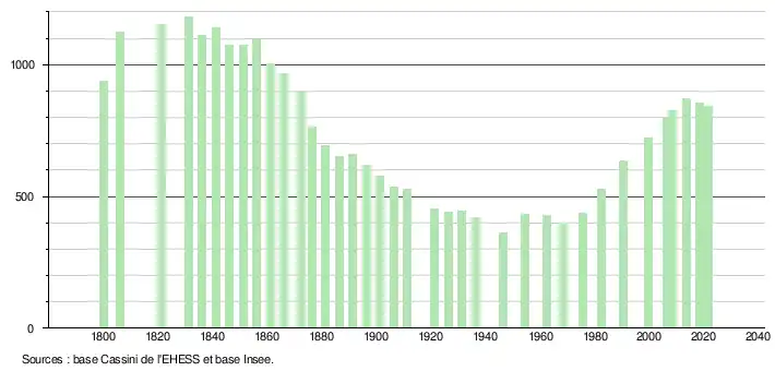 L'évolution du nombre d'habitants est connue à travers les recensements de la population effectués dans la commune depuis 1800. Pour les communes de moins de 10 000 habitants, une enquête de recensement portant sur toute la population est réalisée tous les cinq ans, les populations légales des années intermédiaires étant quant à elles estimées par interpolation ou extrapolation[28]. Pour la commune, le premier recensement exhaustif entrant dans le cadre du nouveau dispositif a été réalisé en 2008[29].