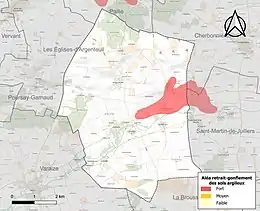 Le retrait-gonflement des sols argileux est susceptible d'engendrer des dommages importants aux bâtiments en cas d’alternance de périodes de sécheresse et de pluie. 5,5 % de la superficie communale est en aléa moyen ou fort (54,2 % au niveau départemental et 48,5 % au niveau national). Sur les 245 bâtiments dénombrés sur la commune en 2019, 39 sont en aléa moyen ou fort, soit 16 %, à comparer aux 57 % au niveau départemental et 54 % au niveau national. Une cartographie de l'exposition du territoire national au retrait gonflement des sols argileux est disponible sur le site du BRGM[12],[Carte 2].