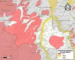Les mouvements de terrains susceptibles de se produire sur la commune sont des affaissements et effondrements liés aux cavités souterraines (hors mines) et des tassements différentiels[19]. Afin de mieux appréhender le risque d’affaissement de terrain, un inventaire national permet de localiser les éventuelles cavités souterraines sur la commune[20]. Le retrait-gonflement des sols argileux est susceptible d'engendrer des dommages importants aux bâtiments en cas d’alternance de périodes de sécheresse et de pluie[21]. 57,1 % de la superficie communale est en aléa moyen ou fort (79,5 % au niveau départemental et 48,5 % au niveau national)[Carte 2]. Depuis le , en application de la loi ÉLAN, différentes contraintes s'imposent aux vendeurs, maîtres d'ouvrages ou constructeurs de biens situés dans une zone classée en aléa moyen ou fort[Note 2],[22].