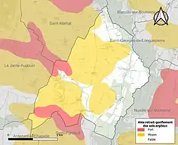 Le retrait-gonflement des sols argileux est susceptible d'engendrer des dommages importants aux bâtiments en cas d’alternance de périodes de sécheresse et de pluie. 60,4 % de la superficie communale est en aléa moyen ou fort (54,2 % au niveau départemental et 48,5 % au niveau national). Sur les 142 bâtiments dénombrés sur la commune en 2019, 93 sont en aléa moyen ou fort, soit 65 %, à comparer aux 57 % au niveau départemental et 54 % au niveau national. Une cartographie de l'exposition du territoire national au retrait gonflement des sols argileux est disponible sur le site du BRGM[13],[Carte 2].