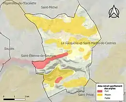 La commune est vulnérable au risque de mouvements de terrains constitué principalement du retrait-gonflement des sols argileux[24]. Cet aléa est susceptible d'engendrer des dommages importants aux bâtiments en cas d’alternance de périodes de sécheresse et de pluie. 44,6 % de la superficie communale est en aléa moyen ou fort (59,3 % au niveau départemental et 48,5 % au niveau national). Sur les 88 bâtiments dénombrés sur la commune en 2019, 75 sont en aléa moyen ou fort, soit 85 %, à comparer aux 85 % au niveau départemental et 54 % au niveau national. Une cartographie de l'exposition du territoire national au retrait gonflement des sols argileux est disponible sur le site du BRGM[25],[Carte 2].