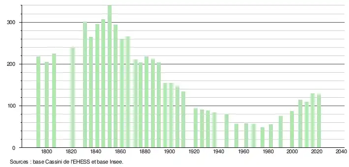 L'évolution du nombre d'habitants est connue à travers les recensements de la population effectués dans la commune depuis 1793. Pour les communes de moins de 10 000 habitants, une enquête de recensement portant sur toute la population est réalisée tous les cinq ans, les populations légales des années intermédiaires étant quant à elles estimées par interpolation ou extrapolation[28]. Pour la commune, le premier recensement exhaustif entrant dans le cadre du nouveau dispositif a été réalisé en 2006[29].
