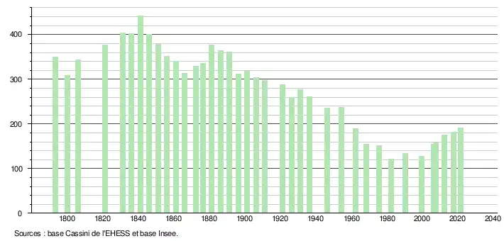 L'évolution du nombre d'habitants est connue à travers les recensements de la population effectués dans la commune depuis 1793. Pour les communes de moins de 10 000 habitants, une enquête de recensement portant sur toute la population est réalisée tous les cinq ans, les populations légales des années intermédiaires étant quant à elles estimées par interpolation ou extrapolation[27]. Pour la commune, le premier recensement exhaustif entrant dans le cadre du nouveau dispositif a été réalisé en 2007[28].