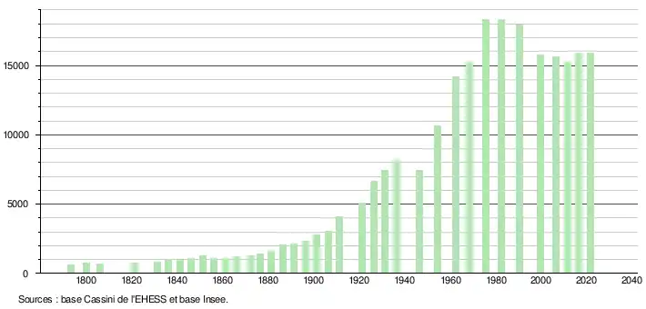 - Par convention dans Wikipédia, le principe a été retenu de n’afficher dans le tableau des recensements et le graphique, pour les populations légales postérieures à 1999, que les populations correspondant à une enquête exhaustive de recensement pour les communes de moins de 10 000 habitants, et que les populations des années 2006, 2011, 2016, etc. pour les communes de plus de 10 000 habitants, ainsi que la dernière population légale publiée par l’Insee pour l'ensemble des communes.