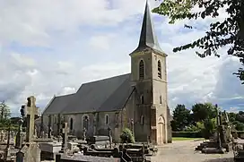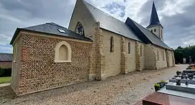 L'église, qui dépend du diocèse de Bayeux-Lisieux, a été principalement construite au XIIIe siècle, sous le patronage du prieur de Sainte-Barbe-en-Auge[55]. Elle reprend toutefois un bâti plus ancien, remontant au XIIe siècle ou XIIe siècle, et qui constitue le mur nord de la nef. L'édifice comprend un clocher-porche, une nef et un chœur de trois travées.