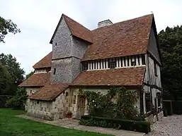 Construit dans le dernier quart du xve siècle, le manoir comprend, selon la description du services des monuments historiques[63], « un encorbellement sur sommiers, une sablière de chambrée d'une seule pièce, un escalier compris dans une tourelle carrée, une galerie en encorbellement, une grande lucarne, des cheminées monumentales et des portes intérieures à plis de serviette. La cour en herbe est délimitée par les bâtiments d'exploitation comprenant une écurie-charretterie, une grange et une étable. Le pressoir du XVIIe siècle a été démonté en 1993. »[64]