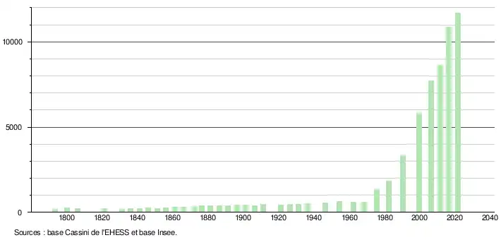 - Par convention dans Wikipédia, le principe a été retenu de n’afficher dans le tableau des recensements et le graphique, pour les populations légales postérieures à 1999, que les populations correspondant à une enquête exhaustive de recensement pour les communes de moins de 10 000 habitants, et que les populations des années 2006, 2011, 2016, etc. pour les communes de plus de 10 000 habitants, ainsi que la dernière population légale publiée par l’Insee pour l'ensemble des communes.