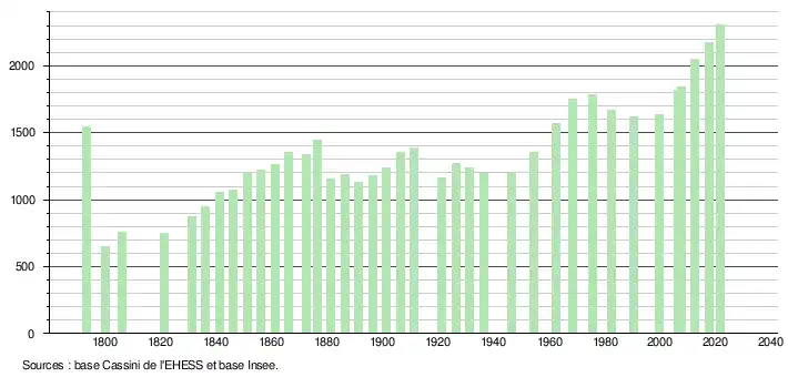 L'évolution du nombre d'habitants est connue à travers les recensements de la population effectués dans la commune depuis 1793. Pour les communes de moins de 10 000 habitants, une enquête de recensement portant sur toute la population est réalisée tous les cinq ans, les populations légales des années intermédiaires étant quant à elles estimées par interpolation ou extrapolation[31]. Pour la commune, le premier recensement exhaustif entrant dans le cadre du nouveau dispositif a été réalisé en 2007[32].