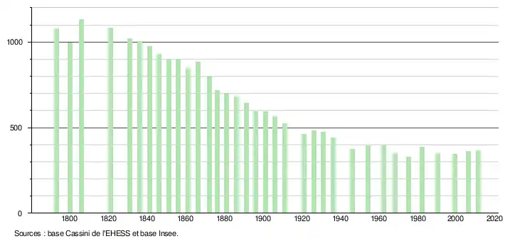 - Dans le tableau des recensements et le graphique, par convention dans Wikipédia, le principe a été retenu, pour les populations légales postérieures à 1999 de n’afficher dans le tableau des recensements et le graphique que les populations correspondant à l'année 2006, première population légale publiée calculée conformément aux concepts définis dans le décret no 2003-485 du 5 juin 2003, et les années correspondant à une enquête exhaustive de recensement pour les communes de moins de 10 000 habitants, ainsi que la dernière population légale publiée par l’Insee.