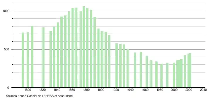 L'évolution du nombre d'habitants est connue à travers les recensements de la population effectués dans la commune depuis 1793. Pour les communes de moins de 10 000 habitants, une enquête de recensement portant sur toute la population est réalisée tous les cinq ans, les populations légales des années intermédiaires étant quant à elles estimées par interpolation ou extrapolation[33]. Pour la commune, le premier recensement exhaustif entrant dans le cadre du nouveau dispositif a été réalisé en 2004[34].