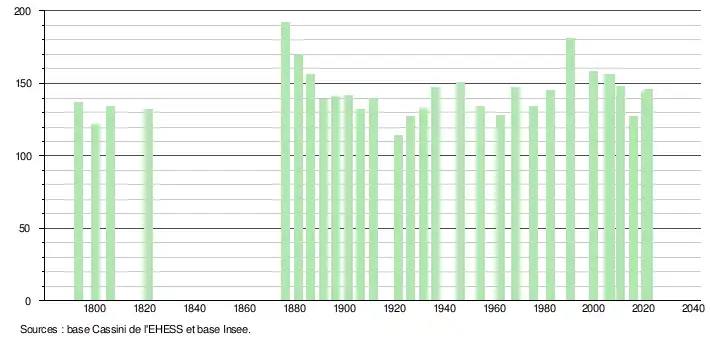 L'évolution du nombre d'habitants est connue à travers les recensements de la population effectués dans la commune depuis 1793. Pour les communes de moins de 10 000 habitants, une enquête de recensement portant sur toute la population est réalisée tous les cinq ans, les populations légales des années intermédiaires étant quant à elles estimées par interpolation ou extrapolation[16]. Pour la commune, le premier recensement exhaustif entrant dans le cadre du nouveau dispositif a été réalisé en 2005[17].