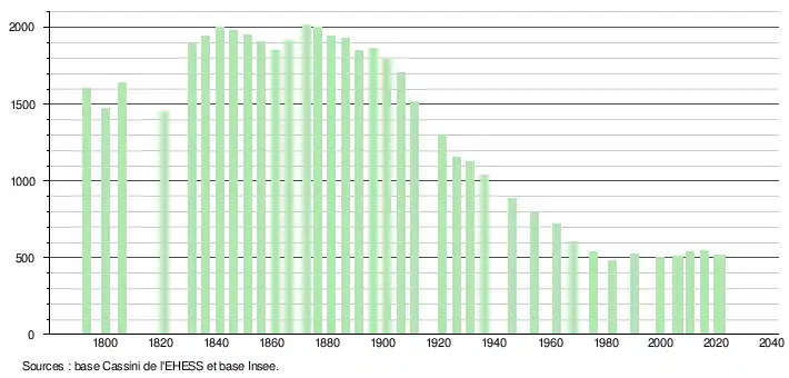 L'évolution du nombre d'habitants est connue à travers les recensements de la population effectués dans la commune depuis 1793. Pour les communes de moins de 10 000 habitants, une enquête de recensement portant sur toute la population est réalisée tous les cinq ans, les populations légales des années intermédiaires étant quant à elles estimées par interpolation ou extrapolation[17]. Pour la commune, le premier recensement exhaustif entrant dans le cadre du nouveau dispositif a été réalisé en 2005[18].