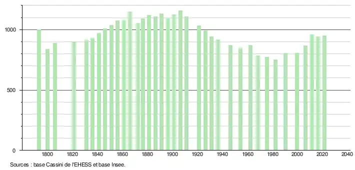 L'évolution du nombre d'habitants est connue à travers les recensements de la population effectués dans la commune depuis 1793. Pour les communes de moins de 10 000 habitants, une enquête de recensement portant sur toute la population est réalisée tous les cinq ans, les populations légales des années intermédiaires étant quant à elles estimées par interpolation ou extrapolation[21]. Pour la commune, le premier recensement exhaustif entrant dans le cadre du nouveau dispositif a été réalisé en 2006[22].