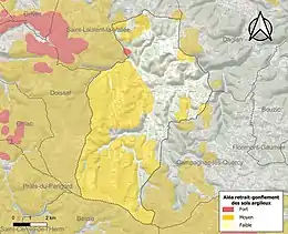 Les mouvements de terrains susceptibles de se produire sur la commune sont des tassements différentiels[36]. Le retrait-gonflement des sols argileux est susceptible d'engendrer des dommages importants aux bâtiments en cas d’alternance de périodes de sécheresse et de pluie[37]. 56,8 % de la superficie communale est en aléa moyen ou fort (58,6 % au niveau départemental et 48,5 % au niveau national métropolitain)[Carte 4]. Depuis le , en application de la loi ÉLAN, différentes contraintes s'imposent aux vendeurs, maîtres d'ouvrages ou constructeurs de biens situés dans une zone classée en aléa moyen ou fort[Note 5],[38].