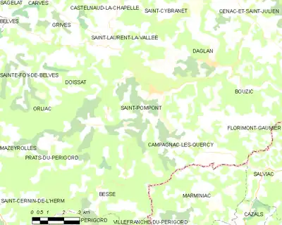 Saint-Pompon est limitrophe de cinq autres communes. Au sud-est, son territoire est distant d'environ 350 mètres de celui de Marminiac (dans le Lot) et au sud-ouest de 380 mètres de celui de Prats-du-Périgord.