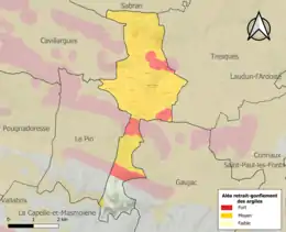 Le retrait-gonflement des sols argileux est susceptible d'engendrer des dommages importants aux bâtiments en cas d’alternance de périodes de sécheresse et de pluie. 87,4 % de la superficie communale est en aléa moyen ou fort (67,5 % au niveau départemental et 48,5 % au niveau national). Sur les 220 bâtiments dénombrés sur la commune en 2019, 214 sont en aléa moyen ou fort, soit 97 %, à comparer aux 90 % au niveau départemental et 54 % au niveau national. Une cartographie de l'exposition du territoire national au retrait gonflement des sols argileux est disponible sur le site du BRGM[16],[Carte 2].
