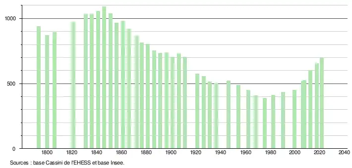 L'évolution du nombre d'habitants est connue à travers les recensements de la population effectués dans la commune depuis 1793. Pour les communes de moins de 10 000 habitants, une enquête de recensement portant sur toute la population est réalisée tous les cinq ans, les populations légales des années intermédiaires étant quant à elles estimées par interpolation ou extrapolation[24]. Pour la commune, le premier recensement exhaustif entrant dans le cadre du nouveau dispositif a été réalisé en 2007[25].