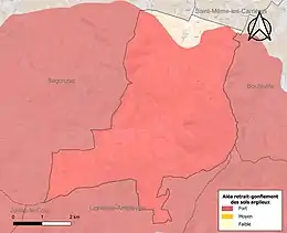 Le retrait-gonflement des sols argileux est susceptible d'engendrer des dommages importants aux bâtiments en cas d’alternance de périodes de sécheresse et de pluie. 94,1 % de la superficie communale est en aléa moyen ou fort (67,4 % au niveau départemental et 48,5 % au niveau national). Sur les 171 bâtiments dénombrés sur la commune en 2019, 164 sont en aléa moyen ou fort, soit 96 %, à comparer aux 81 % au niveau départemental et 54 % au niveau national. Une cartographie de l'exposition du territoire national au retrait gonflement des sols argileux est disponible sur le site du BRGM[17],[Carte 3].