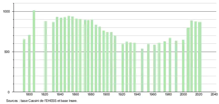 L'évolution du nombre d'habitants est connue à travers les recensements de la population effectués dans la commune depuis 1793. Pour les communes de moins de 10 000 habitants, une enquête de recensement portant sur toute la population est réalisée tous les cinq ans, les populations légales des années intermédiaires étant quant à elles estimées par interpolation ou extrapolation[44]. Pour la commune, le premier recensement exhaustif entrant dans le cadre du nouveau dispositif a été réalisé en 2005[45].