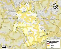 Le retrait-gonflement des sols argileux est susceptible d'engendrer des dommages importants aux bâtiments en cas d’alternance de périodes de sécheresse et de pluie. 46,4 % de la superficie communale est en aléa moyen ou fort (33,6 % au niveau départemental et 48,5 % au niveau national). Sur les 461 bâtiments dénombrés sur la commune en 2019, 101 sont en aléa moyen ou fort, soit 22 %, à comparer aux 25 % au niveau départemental et 54 % au niveau national. Une cartographie de l'exposition du territoire national au retrait gonflement des sols argileux est disponible sur le site du BRGM[18],[Carte 2].