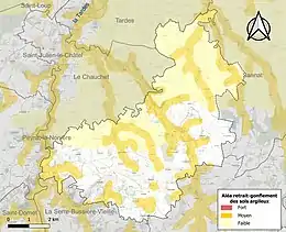 Le retrait-gonflement des sols argileux est susceptible d'engendrer des dommages importants aux bâtiments en cas d’alternance de périodes de sécheresse et de pluie. 30,5 % de la superficie communale est en aléa moyen ou fort (33,6 % au niveau départemental et 48,5 % au niveau national). Sur les 164 bâtiments dénombrés sur la commune en 2019, 65 sont en aléa moyen ou fort, soit 40 %, à comparer aux 25 % au niveau départemental et 54 % au niveau national. Une cartographie de l'exposition du territoire national au retrait gonflement des sols argileux est disponible sur le site du BRGM[17],[Carte 2].
