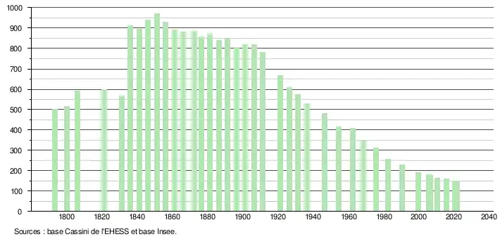 L'évolution du nombre d'habitants est connue à travers les recensements de la population effectués dans la commune depuis 1793. Pour les communes de moins de 10 000 habitants, une enquête de recensement portant sur toute la population est réalisée tous les cinq ans, les populations légales des années intermédiaires étant quant à elles estimées par interpolation ou extrapolation[23]. Pour la commune, le premier recensement exhaustif entrant dans le cadre du nouveau dispositif a été réalisé en 2005[24].